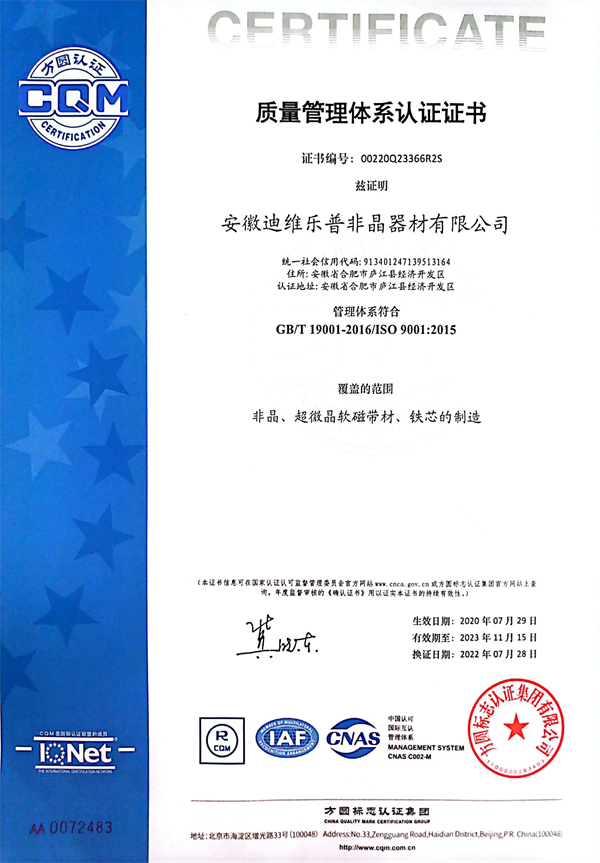 為響應國家標準化發(fā)展綱要,推動高質(zhì)量發(fā)展,建設社會主義現(xiàn)代化國家。 安徽迪維樂普非晶器材有限公司、非晶合金電力互感器材料研究中心;為促進標 準化發(fā)展、提升標準化水平;實現(xiàn)企業(yè)有序發(fā)展、有規(guī)可循;產(chǎn)品質(zhì)量有據(jù)可依、 方便客戶甄別選用,特制定本企業(yè)質(zhì)量標準。
